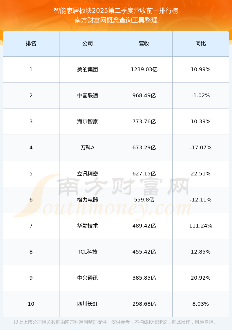 按照南方财富网概念查询工具统计,该股所属板块为智能家居板块,该板块共有299只股票,好太太2025第二季度营收在该板块中排名为第196名,该板块2025第二季度营收排名前十的股票如下表: