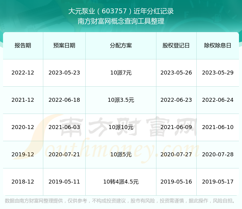 大元泵业最新一次公布的分红方案为10派7元。本次权益分派股权登记日为2023年5月26日,除权除息日为2023年5月29日,派息日为2023年5月29日。