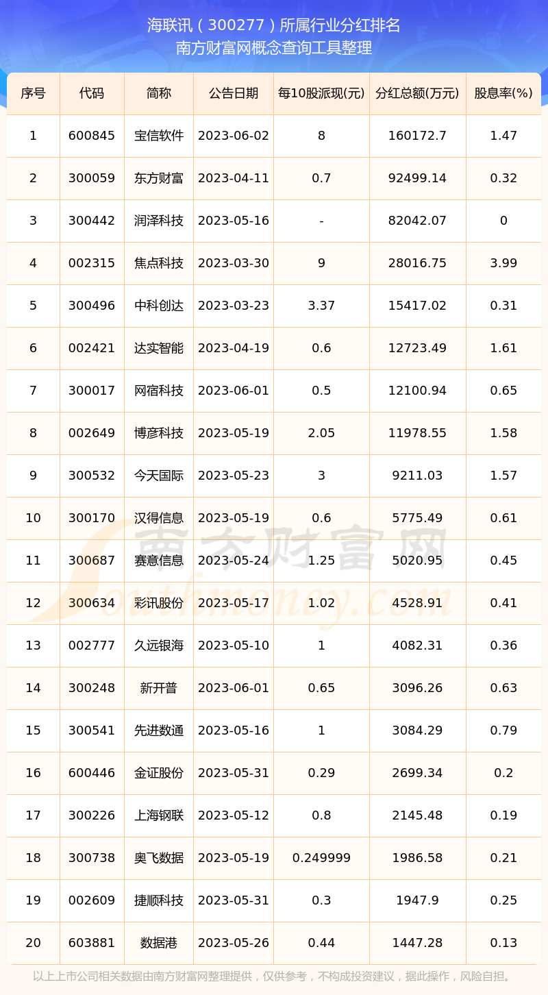 按照南方财富网趋势选股系统统计,海联讯所属行业为互联网服务行业,互联网服务行业分红排名情况如下表: