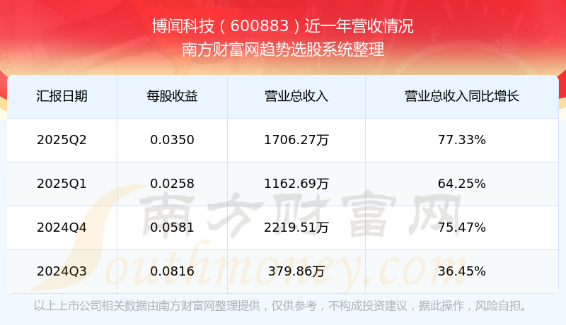 于2025年第二季度,博闻科技披露了其业绩表现,其中主营业务收入1706.27万元,相较于去年同期77.33%。此外,公司归属于母公司的净利润为825.13万元,同比增长了-46.19%。在扣除所有非经常性损益后,净利润604.56万元,同比增长-60.27%。