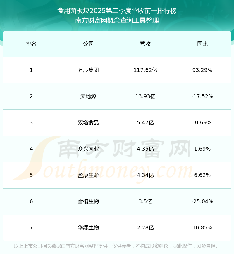 按照南方财富网概念查询工具统计,该股所属板块为食用菌板块,该板块共有7只股票,博闻科技2025第二季度营收在该板块中排名为第7名,该板块2025第二季度营收排名前十的股票如下表: