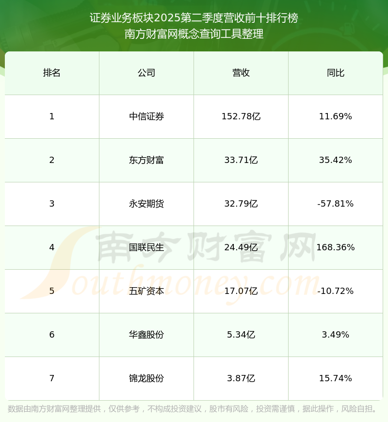 按照南方财富网概念查询工具统计,该股所属板块为证券业务板块,该板块共有7只股票,国金证券2025第二季度营收在该板块中排名为第7名,该板块2025第二季度营收排名前十的股票如下表:
