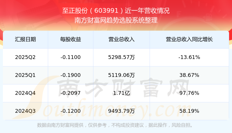 至正股份2025年第二季度财报显示,公司主营收入5298.57万元,同比-13.61%;归母净利润-841.65万元,同比-1166.49%;扣非净利润-870.06万元,同比-299.94%;