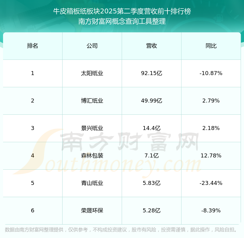 按照南方财富网概念查询工具统计,该股所属板块为牛皮箱板纸板块,该板块共有6只股票,森林包装2025第二季度营收在该板块中排名为第4名,该板块2025第二季度营收排名前十的股票如下表:
