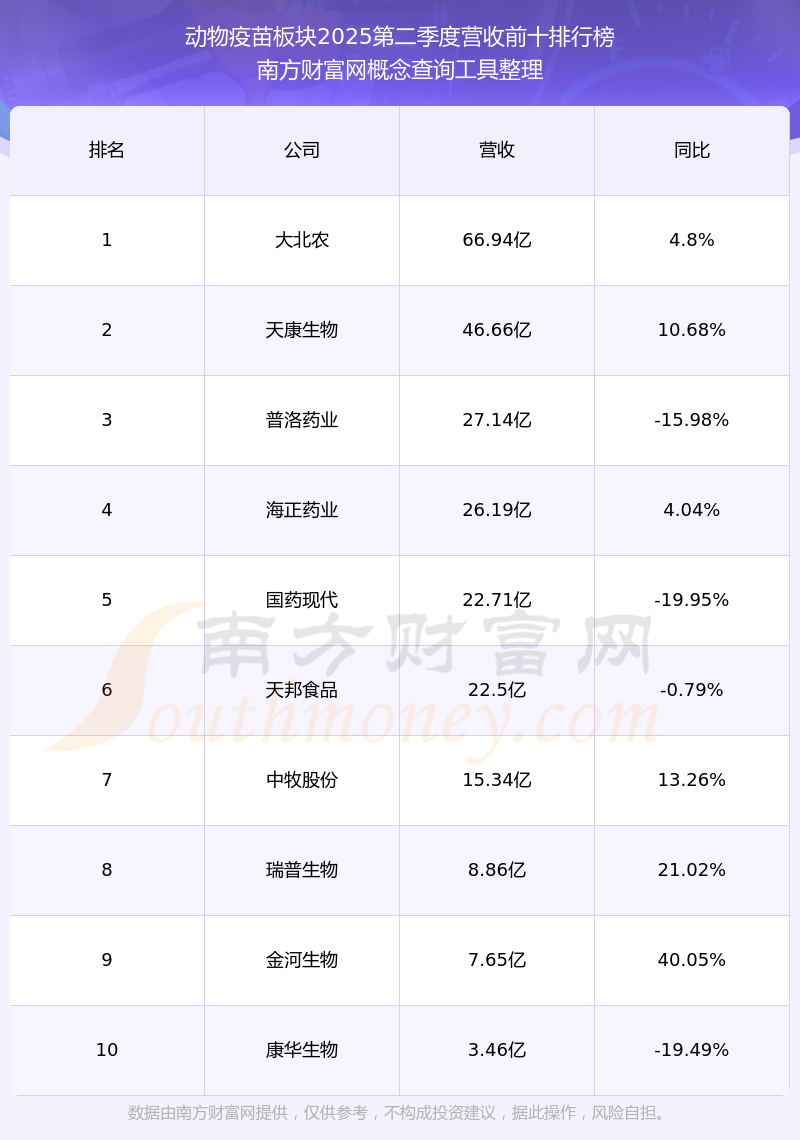 按照南方财富网概念查询工具统计,该股所属板块为动物疫苗板块,该板块共有20只股票,海利生物2025第二季度营收在该板块中排名为第19名,该板块2025第二季度营收排名前十的股票如下表: