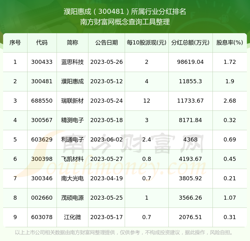 按照南方财富网趋势选股系统统计,濮阳惠成所属行业为电子化学品行业,电子化学品行业分红排名情况如下表: