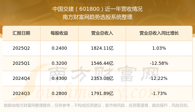 中国交建2025年第二季度财报显示,公司主营收入1824.11亿元,同比1.03%;归母净利润41.02亿元,同比-21.99%;扣非净利润28.34亿元,同比-41.02%;