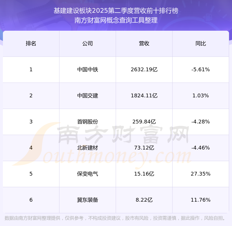 按照南方财富网概念查询工具统计,该股所属板块为基建建设板块,该板块共有6只股票,中国交建2025第二季度营收在该板块中排名为第2名,该板块2025第二季度营收排名前十的股票如下表: