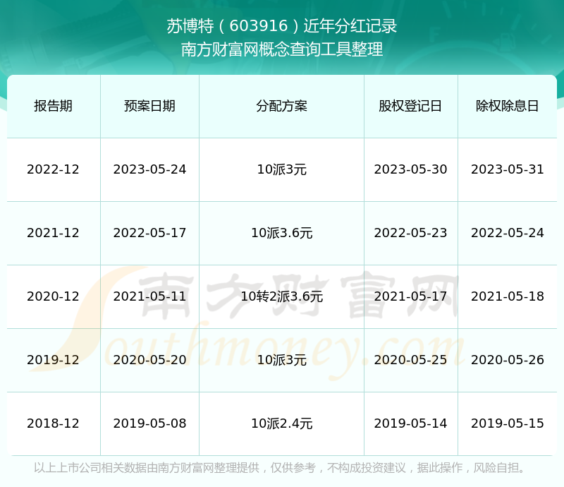 苏博特最新一次公布的分红方案为10派3元。本次权益分派股权登记日为2023年5月30日,除权除息日为2023年5月31日,派息日为2023年5月31日。