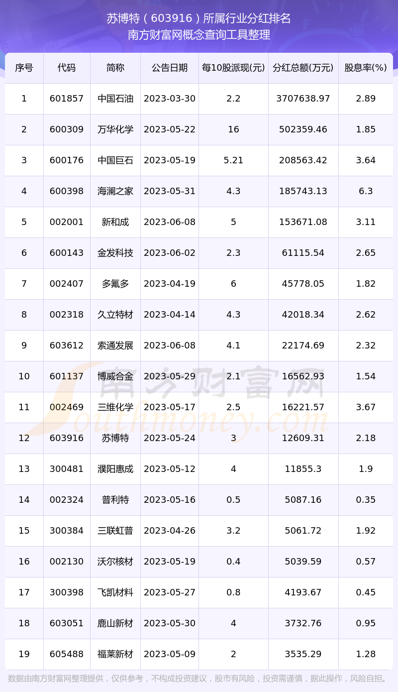按照南方财富网趋势选股系统统计,苏博特所属行业为化学制品行业,化学制品行业分红排名情况如下表: