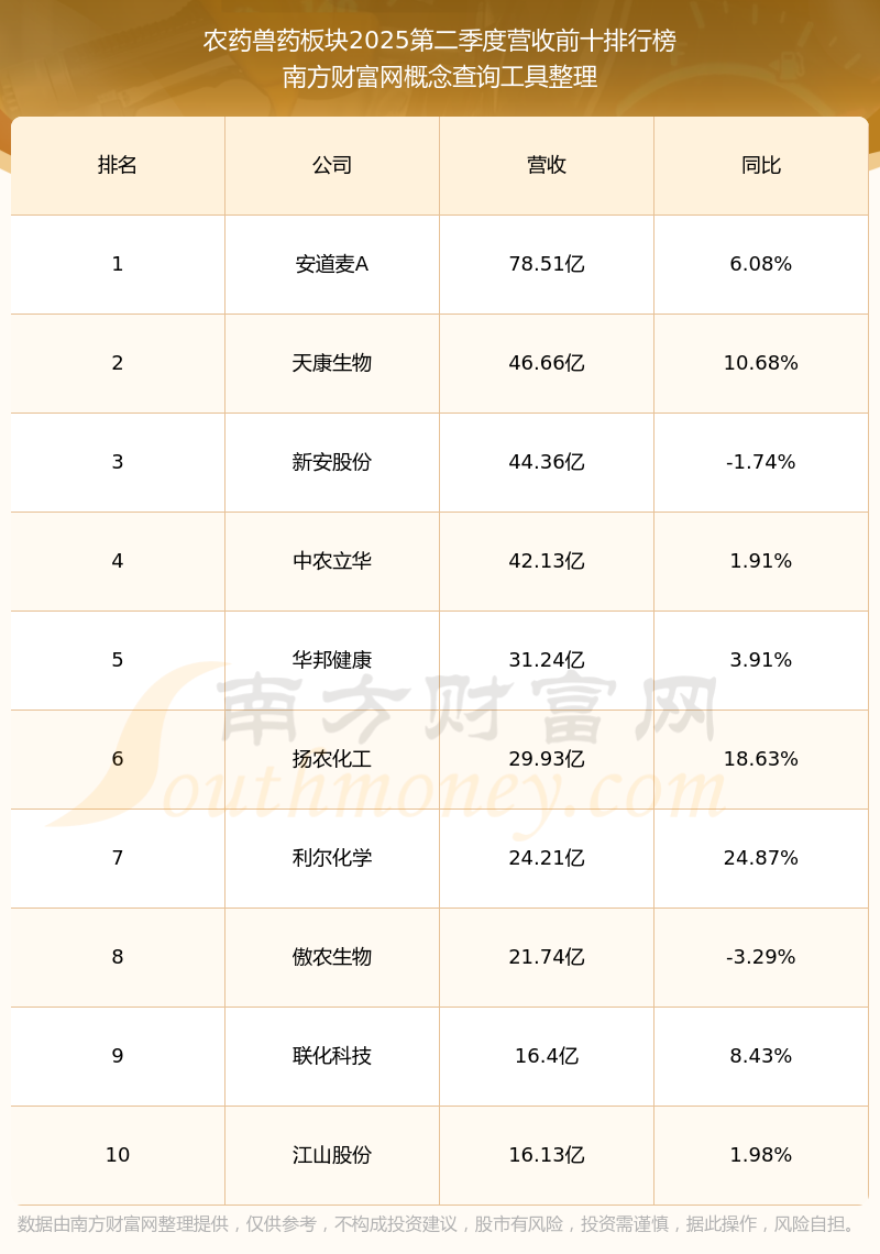 按照南方财富网概念查询工具统计,该股所属板块为农药兽药板块,该板块共有42只股票,苏利股份2025第二季度营收在该板块中排名为第21名,该板块2025第二季度营收排名前十的股票如下表: