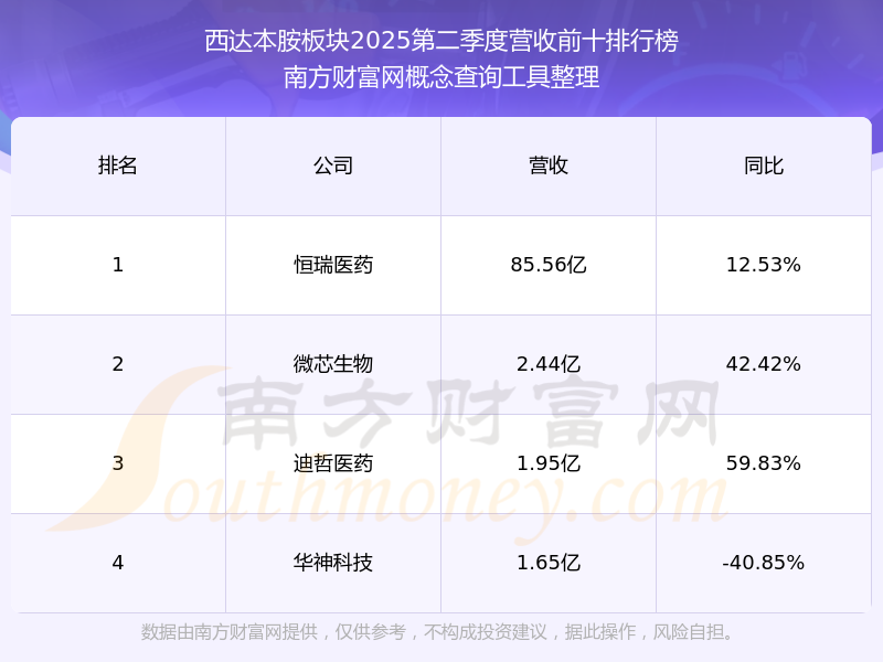 按照南方财富网概念查询工具统计,该股所属板块为西达本胺板块,该板块共有4只股票,微芯生物2025第二季度营收在该板块中排名为第2名,该板块2025第二季度营收排名前十的股票如下表: