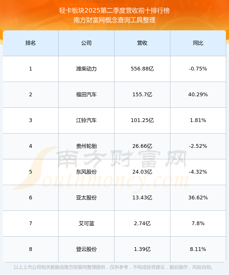 按照南方财富网概念查询工具统计,该股所属板块为轻卡板块,该板块共有8只股票,福田汽车2025第二季度营收在该板块中排名为第2名,该板块2025第二季度营收排名前十的股票如下表: