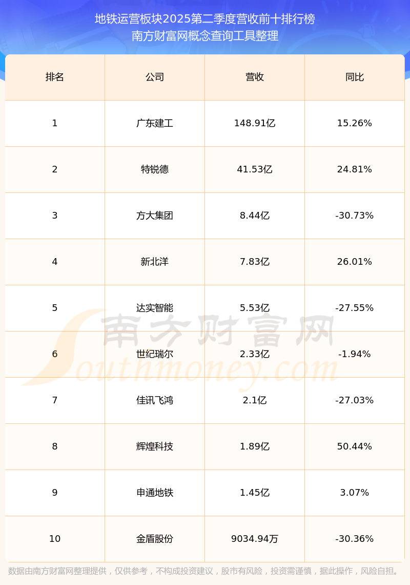 按照南方财富网概念查询工具统计,该股所属板块为地铁运营板块,该板块共有11只股票,申通地铁2025第二季度营收在该板块中排名为第9名,该板块2025第二季度营收排名前十的股票如下表: