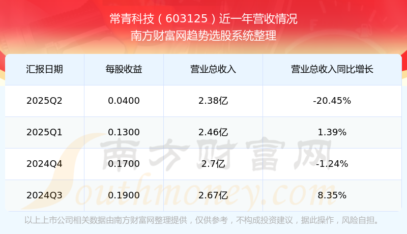 常青科技2025年第二季度财报显示,公司主营收入2.38亿元,同比-20.45%;归母净利润3486.42万元,同比-38.52%;扣非净利润3297.97万元,同比-36.66%。