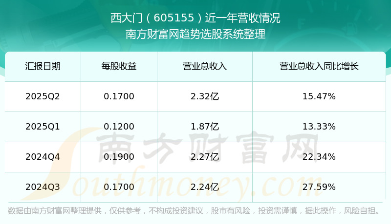 在2025年第二季度,西大门的业绩表现,主营业务收入达到2.32亿元,实现了15.47%的同比增长率。同时,公司归母净利润录得3277.1万元,同比增长3.36%。