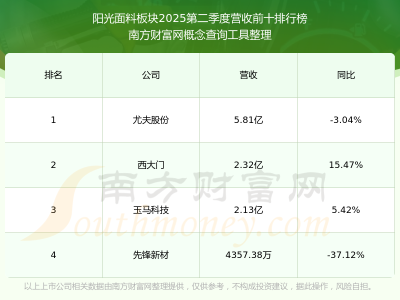 按照南方财富网概念查询工具统计,该股所属板块为阳光面料板块,该板块共有4只股票,西大门2025第二季度营收在该板块中排名为第2名,该板块2025第二季度营收排名前十的股票如下表: