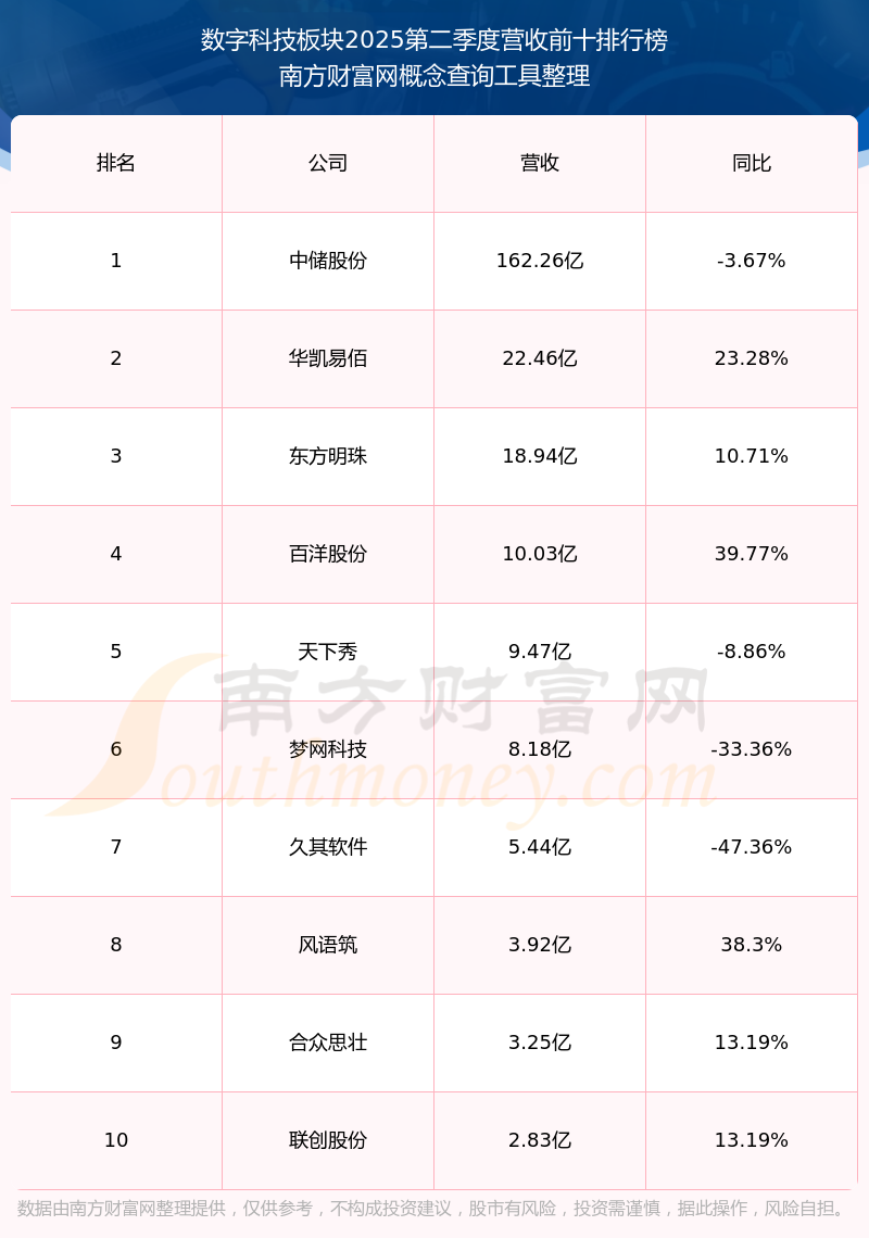 按照南方财富网概念查询工具统计,该股所属板块为数字科技板块,该板块共有18只股票,风语筑2025第二季度营收在该板块中排名为第8名,该板块2025第二季度营收排名前十的股票如下表: