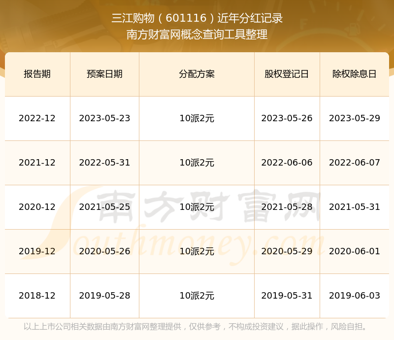 三江购物最新一次公布的分红方案为10派2元。本次权益分派股权登记日为2023年5月26日,除权除息日为2023年5月29日,派息日为2023年5月29日。