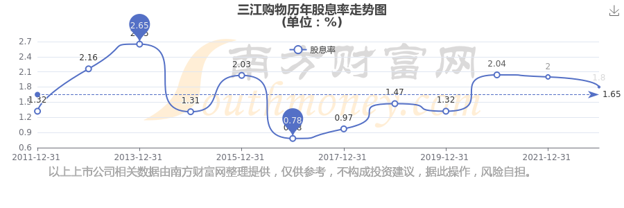 近年三江购物年度股息率走势如下图: