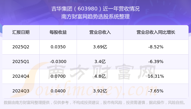 吉华集团2025年第二季度财报显示,公司主营收入3.69亿元,同比-8.52%;归母净利润2422.7万元,同比472.35%;扣非净利润879.96万元,同比634.41%;