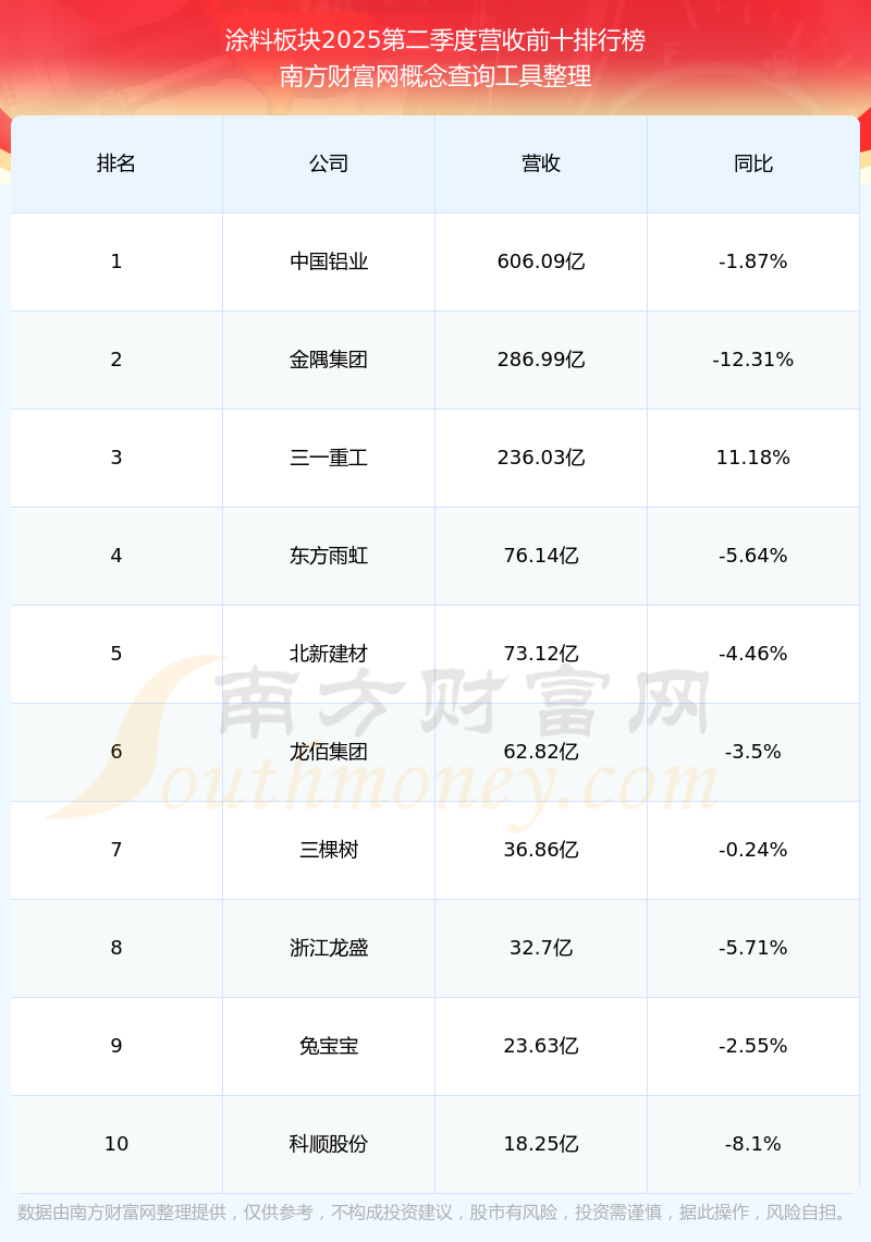 按照南方财富网概念查询工具统计,该股所属板块为涂料板块,该板块共有44只股票,吉华集团2025第二季度营收在该板块中排名为第28名,该板块2025第二季度营收排名前十的股票如下表: