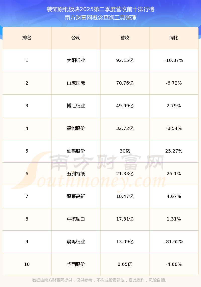 按照南方财富网概念查询工具统计,该股所属板块为装饰原纸板块,该板块共有15只股票,华旺科技2025第二季度营收在该板块中排名为第12名,该板块2025第二季度营收排名前十的股票如下表: