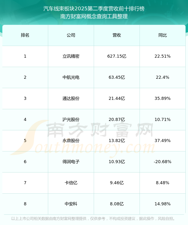 按照南方财富网概念查询工具统计,该股所属板块为汽车线束板块,该板块共有8只股票,沪光股份2025第二季度营收在该板块中排名为第4名,该板块2025第二季度营收排名前十的股票如下表: