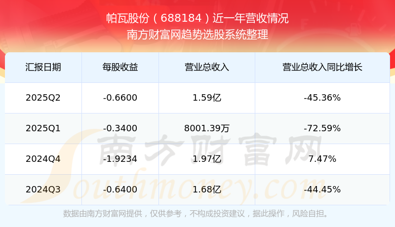 在2025年第二季度,帕瓦股份的业绩表现,主营业务收入达到1.59亿元,实现了-45.36%的同比增长率。同时,公司归母净利润录得-1.02亿元,同比增长55.59%。