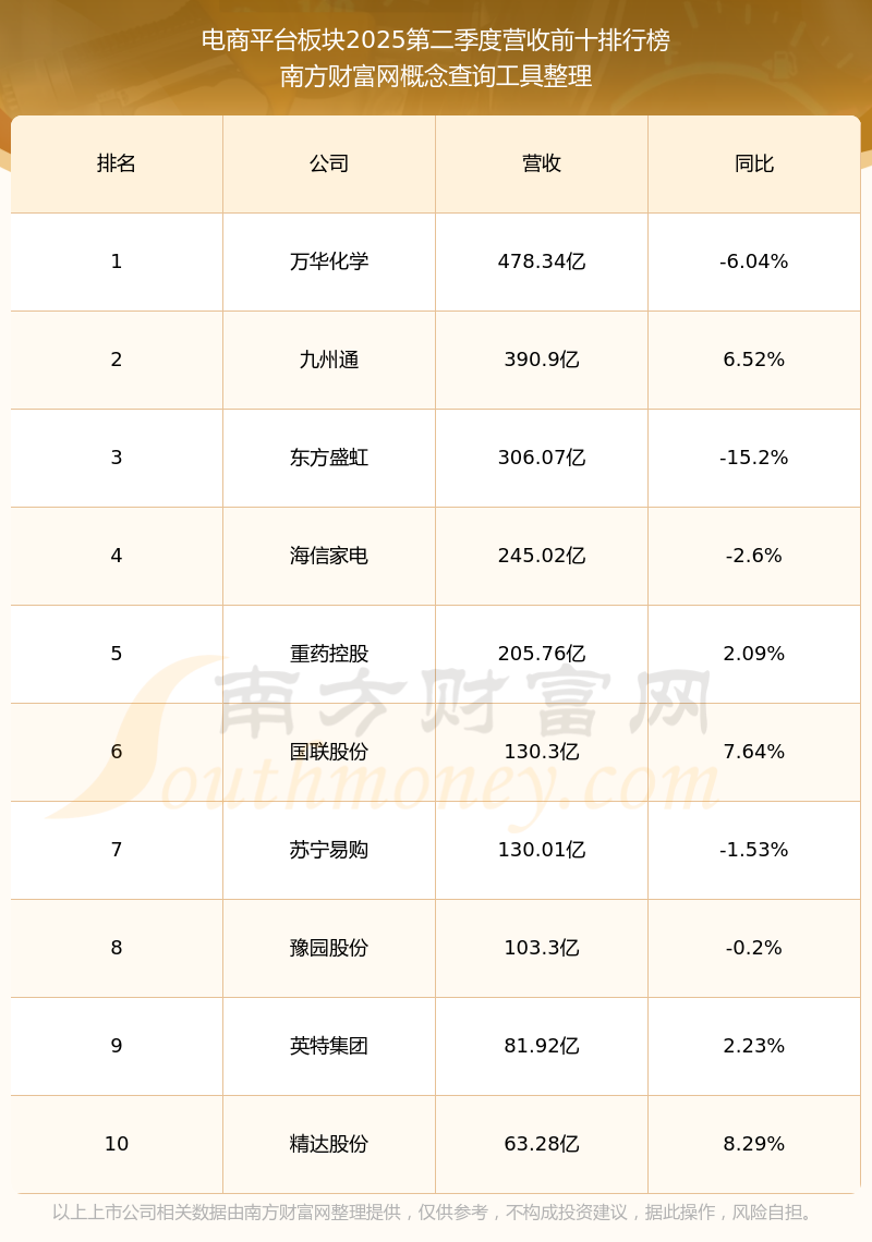 按照南方财富网概念查询工具统计,该股所属板块为电商平台板块,该板块共有58只股票,白云山2025第二季度营收在该板块中排名为第58名,该板块2025第二季度营收排名前十的股票如下表: