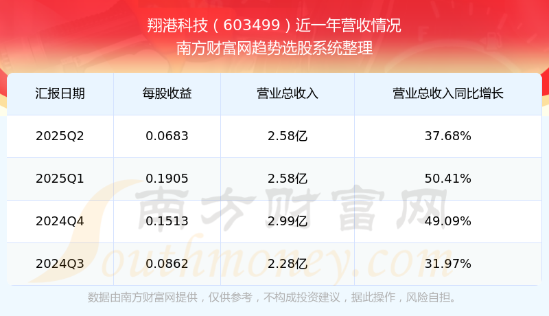 财报显示,2025年第二季度翔港科技营收2.58亿元,同比增长37.68%,净利润3713.26万元,同比增长278.94%。