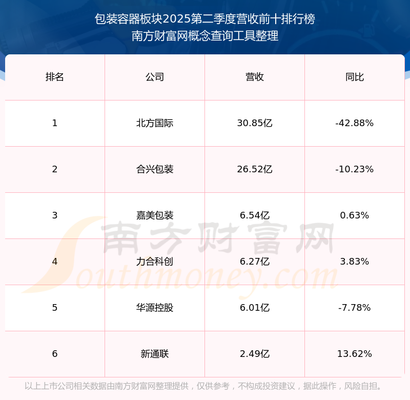 按照南方财富网概念查询工具统计,该股所属板块为包装容器板块,该板块共有6只股票,翔港科技2025第二季度营收在该板块中排名为第6名,该板块2025第二季度营收排名前十的股票如下表:
