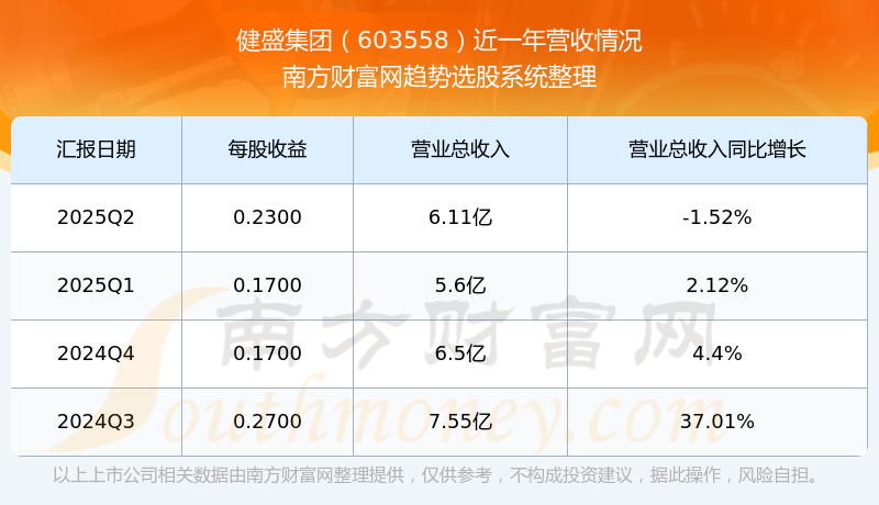在2025年第二季度,健盛集团的业绩表现,主营业务收入达到6.11亿元,实现了-1.52%的同比增长率。同时,公司归母净利润录得8161.68万元,同比增长-2.23%。