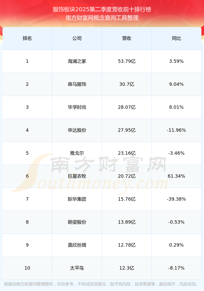 按照南方财富网概念查询工具统计,该股所属板块为服饰板块,该板块共有54只股票,健盛集团2025第二季度营收在该板块中排名为第21名,该板块2025第二季度营收排名前十的股票如下表: