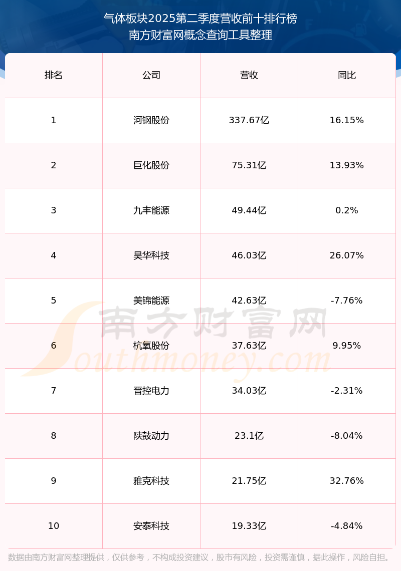 按照南方财富网概念查询工具统计,该股所属板块为气体板块,该板块共有43只股票,广钢气体2025第二季度营收在该板块中排名为第27名,该板块2025第二季度营收排名前十的股票如下表: