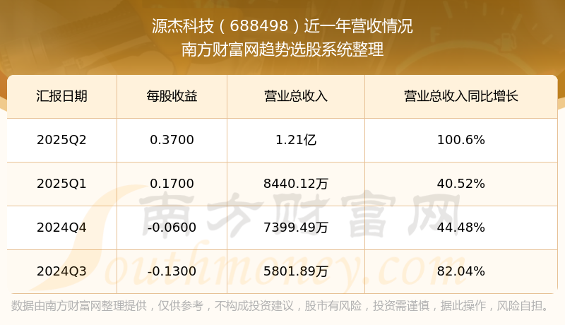 在2025年第二季度,源杰科技的业绩表现,主营业务收入达到1.21亿元,实现了100.6%的同比增长率。同时,公司归母净利润录得3194.37万元,同比增长14666.56%。