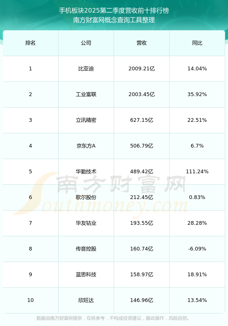 按照南方财富网概念查询工具统计,该股所属板块为手机板块,该板块共有137只股票,龙旗科技2025第二季度营收在该板块中排名为第137名,该板块2025第二季度营收排名前十的股票如下表: