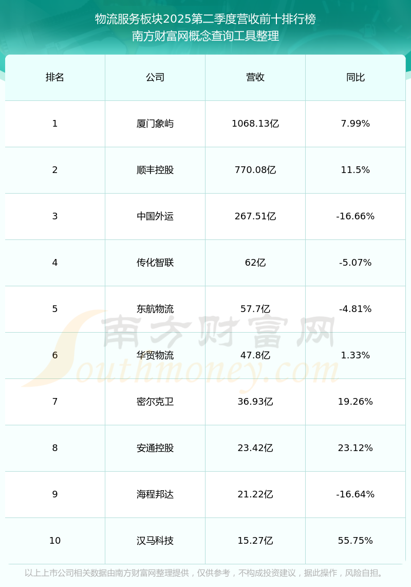按照南方财富网概念查询工具统计,该股所属板块为物流服务板块,该板块共有15只股票,嘉友国际2025第二季度营收在该板块中排名为第15名,该板块2025第二季度营收排名前十的股票如下表: