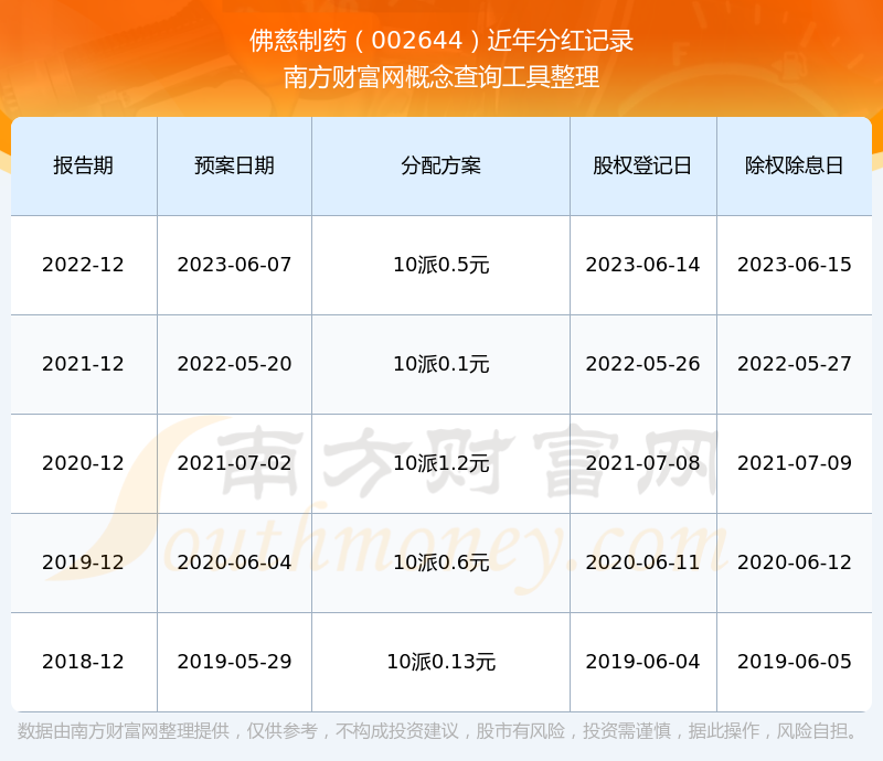 佛慈制药最新一次公布的分红方案为10派0.5元。本次权益分派股权登记日为2023年6月14日,除权除息日为2023年6月15日,派息日为2023年6月15日。