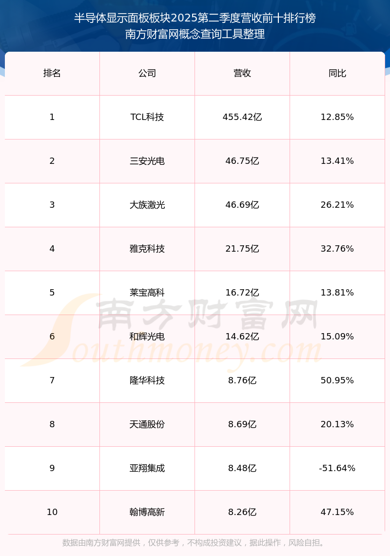 按照南方财富网概念查询工具统计,该股所属板块为半导体显示面板板块,该板块共有21只股票,和辉光电2025第二季度营收在该板块中排名为第6名,该板块2025第二季度营收排名前十的股票如下表: