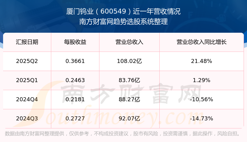 厦门钨业披露了2025年第二季度财报。报告显示,厦门钨业2025年第二季度实现营收108.02亿元,同比21.48%;归母净利润5.81亿元,同比-1.41%。