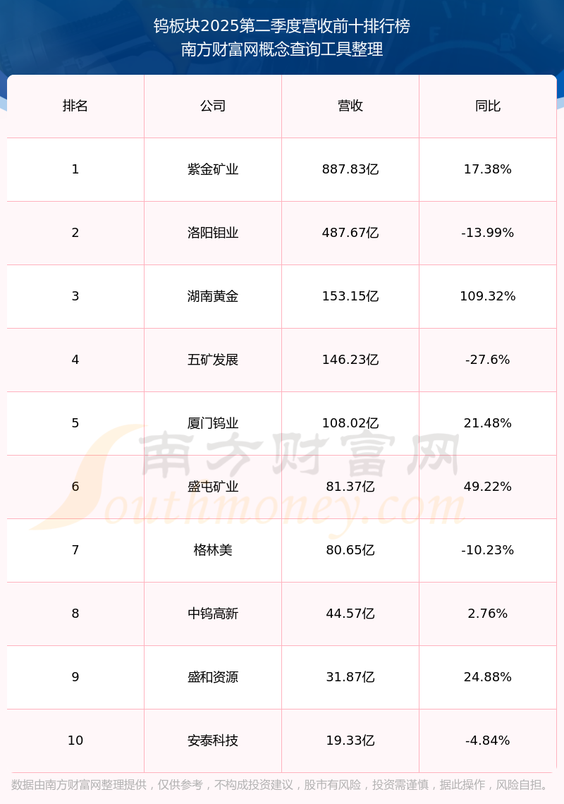 按照南方财富网概念查询工具统计,该股所属板块为钨板块,该板块共有16只股票,厦门钨业2025第二季度营收在该板块中排名为第5名,该板块2025第二季度营收排名前十的股票如下表: