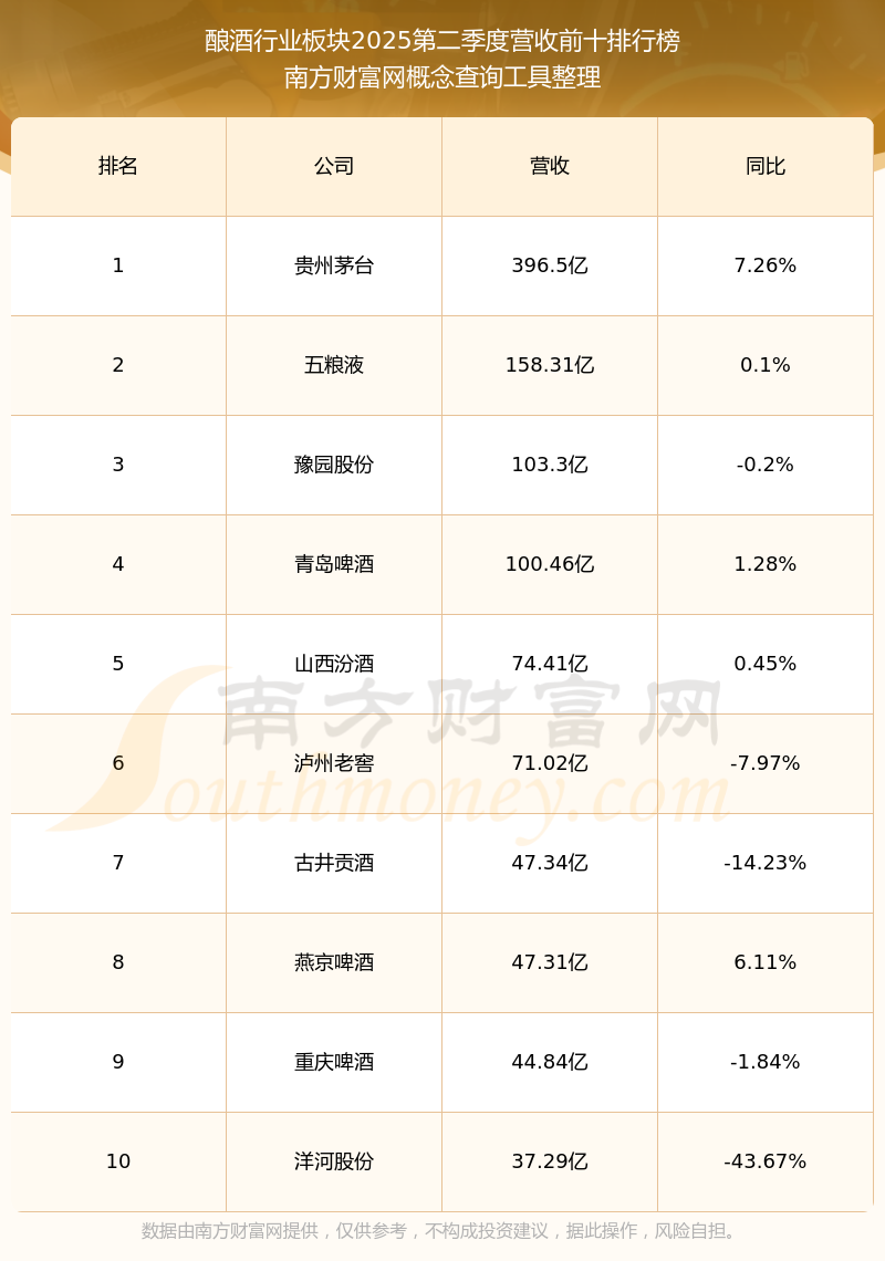 按照南方财富网概念查询工具统计,该股所属板块为酿酒行业板块,该板块共有42只股票,中信尼雅2025第二季度营收在该板块中排名为第41名,该板块2025第二季度营收排名前十的股票如下表: