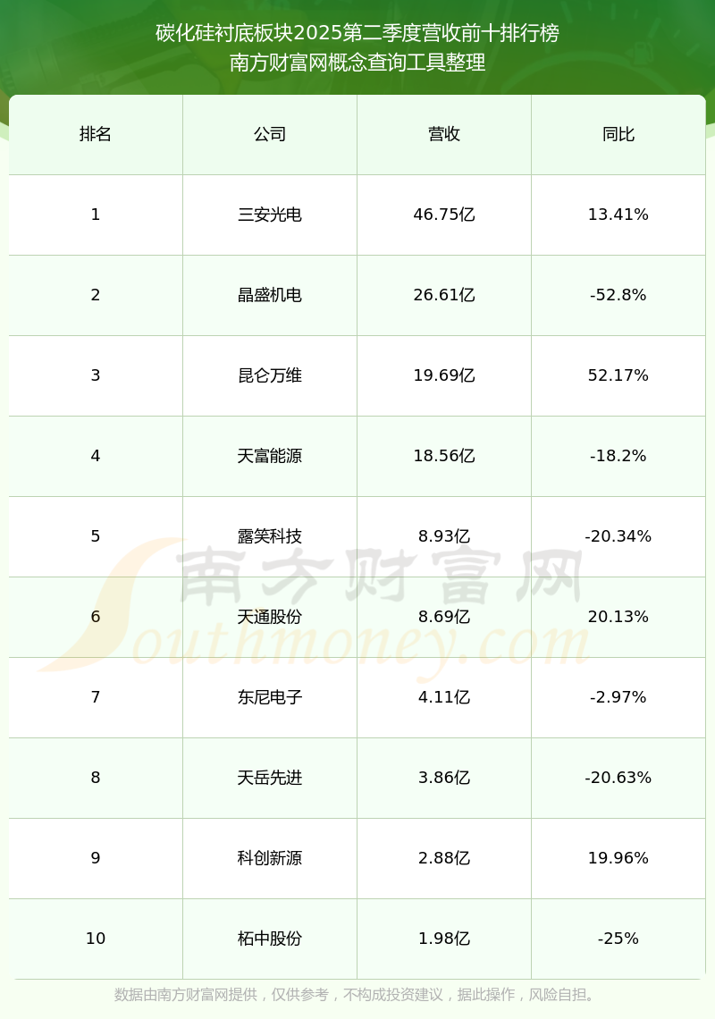 按照南方财富网概念查询工具统计,该股所属板块为碳化硅衬底板块,该板块共有11只股票,天岳先进2025第二季度营收在该板块中排名为第8名,该板块2025第二季度营收排名前十的股票如下表: