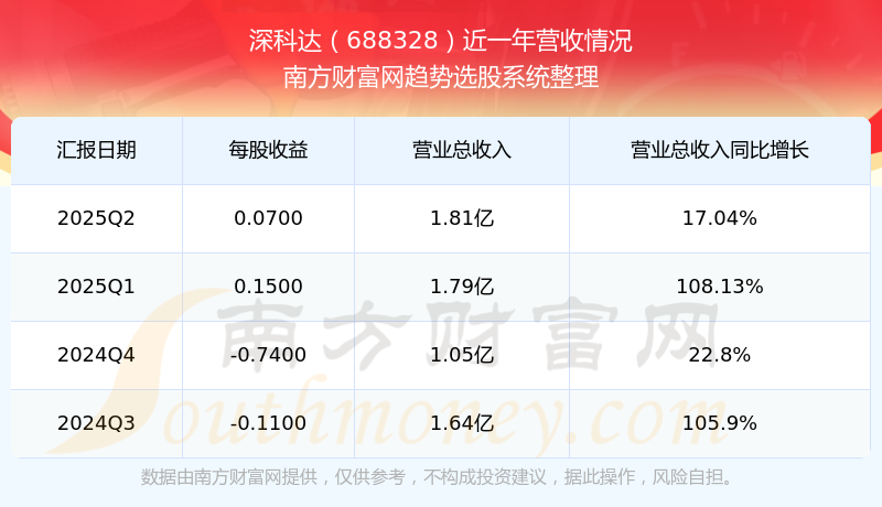 深科达(688328)披露2025年第二季度报告,报告期实现营收1.81亿元,同比17.04%;归母净利润629.87万元,同比1726.35%;扣非净利润541.45万元,同比361.01%。