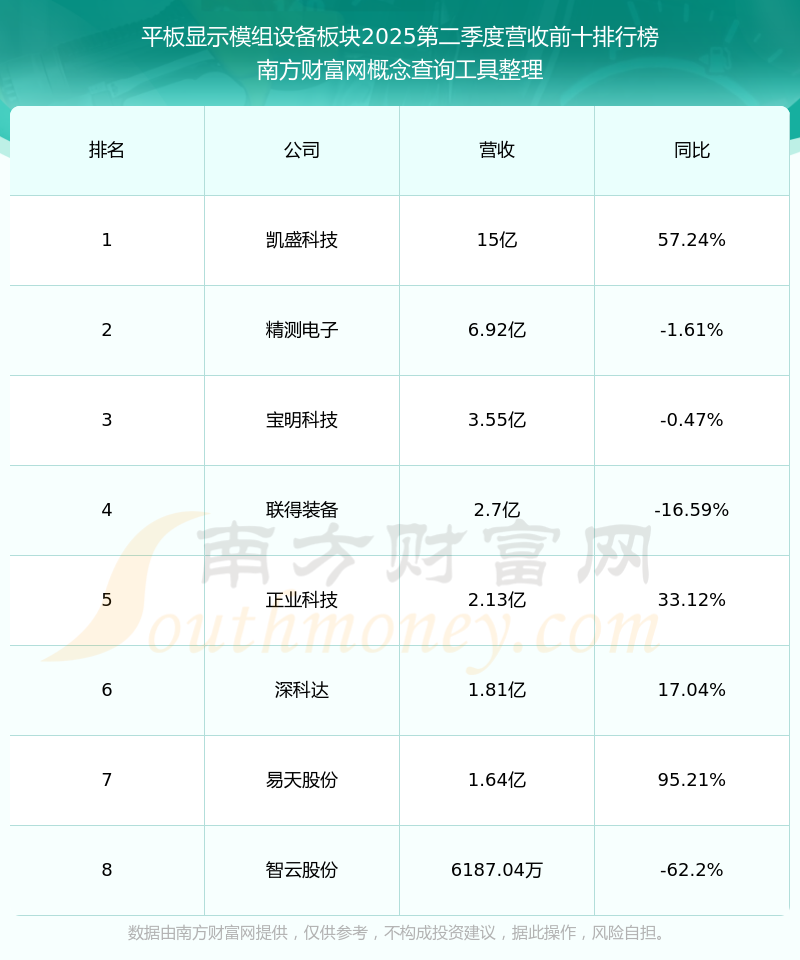 按照南方财富网概念查询工具统计,该股所属板块为平板显示模组设备板块,该板块共有8只股票,深科达2025第二季度营收在该板块中排名为第6名,该板块2025第二季度营收排名前十的股票如下表: