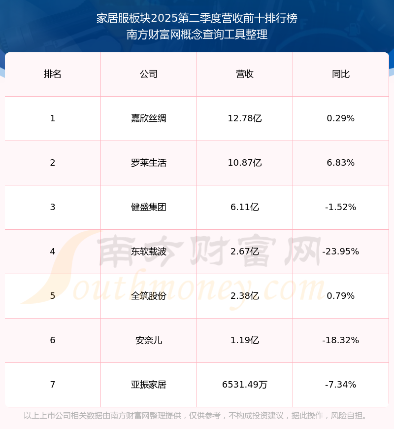 按照南方财富网概念查询工具统计,该股所属板块为家居服板块,该板块共有7只股票,爱慕股份2025第二季度营收在该板块中排名为第7名,该板块2025第二季度营收排名前十的股票如下表: