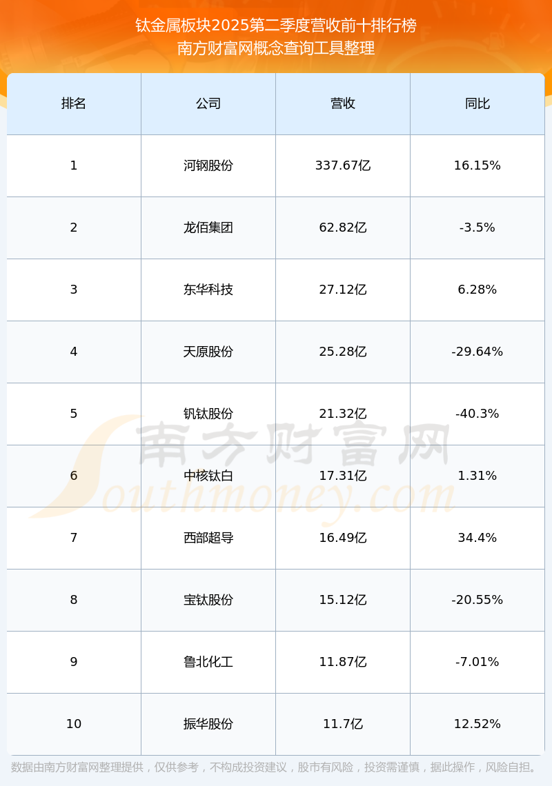 按照南方财富网概念查询工具统计,该股所属板块为钛金属板块,该板块共有22只股票,金天钛业2025第二季度营收在该板块中排名为第22名,该板块2025第二季度营收排名前十的股票如下表: