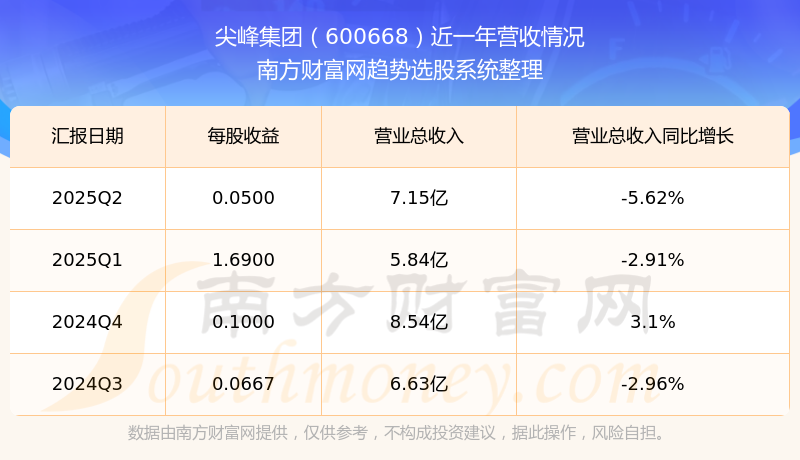 尖峰集团2025年第二季度公司实现营业收入7.15亿元,同比-5.62%;归母净利润3537.72万元,同比-21.72%。