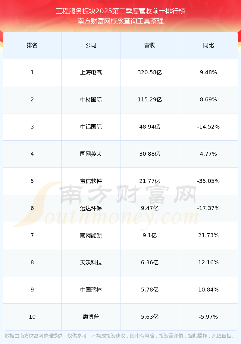 按照南方财富网概念查询工具统计,该股所属板块为工程服务板块,该板块共有11只股票,中材国际2025第二季度营收在该板块中排名为第2名,该板块2025第二季度营收排名前十的股票如下表: